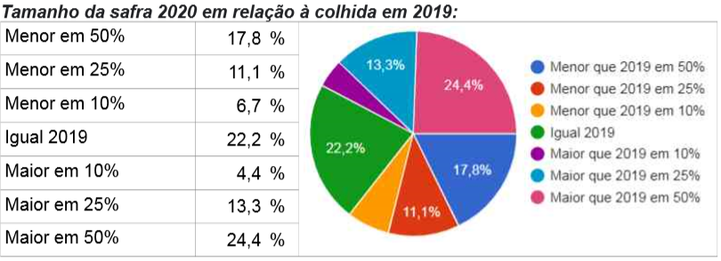 Em relação ao tamanho da safra, 64,3% das propriedades relataram colher igual ou mais que em 2019, sendo que em um quinto delas (24,4%) a safra deve ser 50% maior que a passada. Por outro lado 17,8% colherá até 50% menos, provavelmente em função do manejo de podas. Tais números confirmam a previsão de bienalidade positiva nesta safra, mas com certa estabilidade da produção, atenuando as diferenças entre safras altas e baixas.