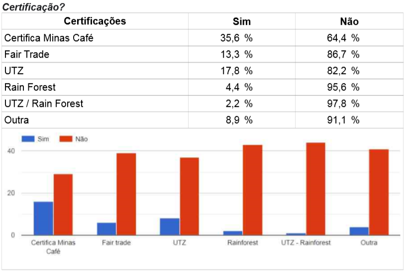Observa-se que ainda é baixo o índice de certificação nas propriedades pesquisadas. Destaque-se que apesar da pesquisa ter sido enviada a partir do cadastro de contatos de um técnico que atende produtores cadastrados no Certifica Minas Café, o leque aberto gira em torno de 1 cliente da certificação para cada 2 não clientes.