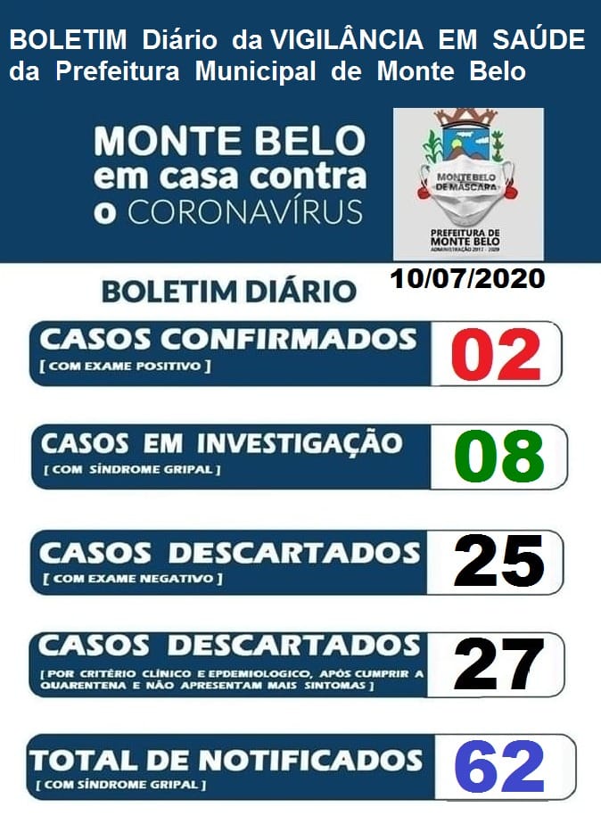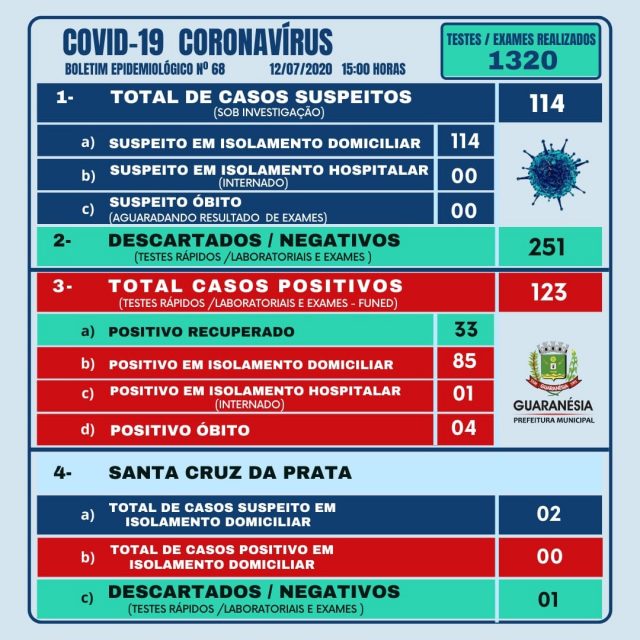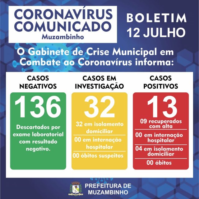 Mais Artigos DestaqueDiversosNossa Cidade Correios divulgam funcionamento especial na semana de ano novo DestaqueObituário Faleceu aos 84 anos o Sr. Cesarino Tristão Silvério DestaqueExecutivoNossa Cidade Prefeitura de Muzambinho alerta empresas sobre a emissão de notas fiscais de serviço a partir de 2026DestaqueSaúdeBoletins do Coronavírus de Muzambinho e cidades vizinhas deste domingo, 12 de Julho. Redação12 de julho de 20201min0 Divulgação dos últimos Boletins Epidemiológico COVID-19 pelas Prefeituras. Post Views: 582BoletimcoronavírusCOVID-19