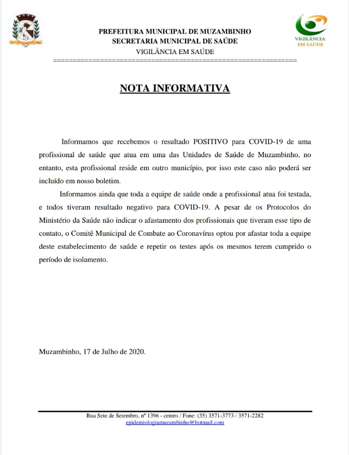 O caso positivo não foi incluso no Boletim Epidemiológico de Muzambinho, uma vez que a profissional não reside na cidade.