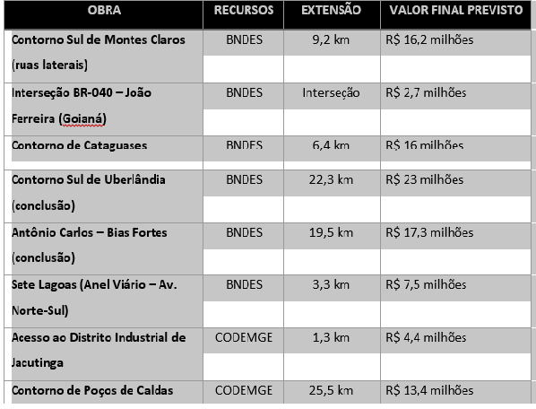 O BNDES disponibilizou recursos para seis obras, sendo elas: Contorno Sul de Montes Claros; Contorno de Cataguases; conclusão do Contorno Sul de Uberlândia; Interseção do entroncamento BR-040 (Barreira do Triunfo) – João Ferreira (Goianá); conclusão da pavimentação do trecho Antônio Carlos – Bias Fortes, na MG-135 e, ainda, a conclusão das obras de pavimentação no Anel Viário de Sete Lagoas (Avenida Norte-Sul). Os investimentos totalizam R$ 82,7 milhões e são saldo dos programas Pro Investe e Programa de Desenvolvimento Integrado II (PDI).