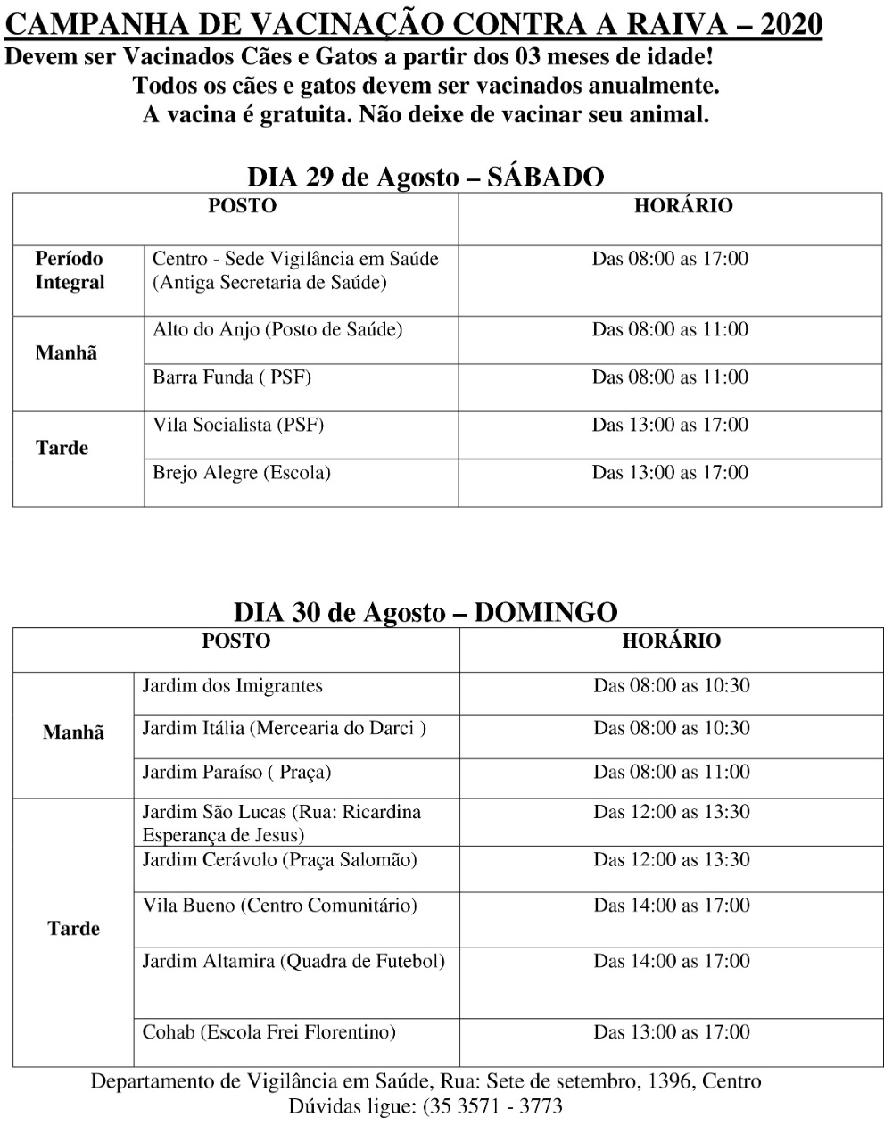 Mais Artigos DestaquePrevisão do Tempo Tempestade e granizo: Brasil tem alerta para 18 estados e o DF; veja a lista Diversos Café e longevidade: a dose diária que faz bem à saúde DestaqueEconomia Segunda parcela do 13º salário deve ser paga nesta semanaDestaqueDiversosNossa CidadeCampanha de Vacinação contra Raiva em Muzambinho Redação28 de agosto de 20201min0Devem ser vacinados cães e gatos a partir dos 3 meses de idade! Post Views: 1.033cachorroCãesgatoRaivaVacina