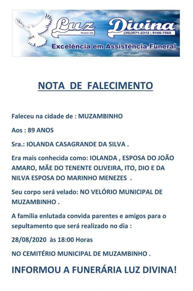 Mais Artigos DestaqueObituário Faleceu aos 78 anos o Sr. Wagner Vieira Gomes DestaqueObituário Faleceu aos 80 anos o Sr. José Carlos Ernesto DestaqueObituário Faleceu aos 69 anos o Sr. Gildo Donizetti NardiObituárioFaleceu aos 89 anos a Sra. Iolanda Casagrande Redação28 de agosto de 20201min0 Post Views: 972EnterroFuneráriamorteobituárioSepultamentoVelório