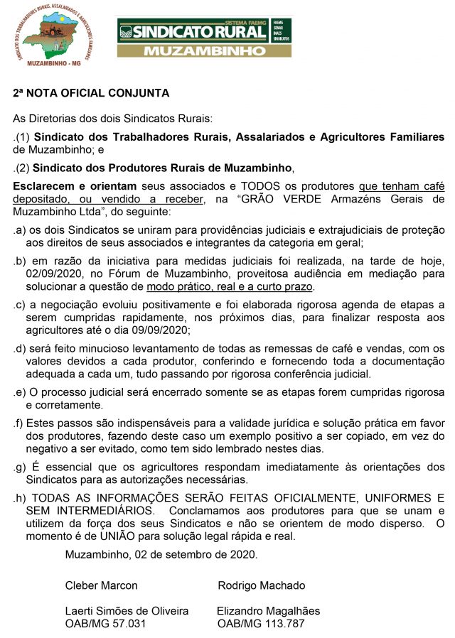 .(1) Sindicato dos Trabalhadores Rurais, Assalariados e Agricultores Familiares de Muzambinho; e
