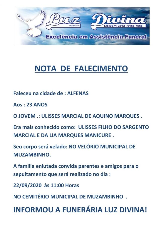 Mais Artigos DestaquePrevisão do Tempo Muzambinho e mais de 400 cidades estão em alerta para chuvas intensas nesta terça DestaqueReflexão O barulho do mundo e o silêncio que nos falta DestaqueLegislativoNossa CidadePolítica Confira as falas da 6ª Reunião Ordinária de Vereadores em Muzambinho – 16/03/2026DestaqueObituárioFaleceu aos 23 anos o jovem Ulisses Marcial de Aquino Marques Redação22 de setembro de 20201min0 Post Views: 1.100EnterroFuneráriaLuz DivinamorteobituárioSepultamentoVelório