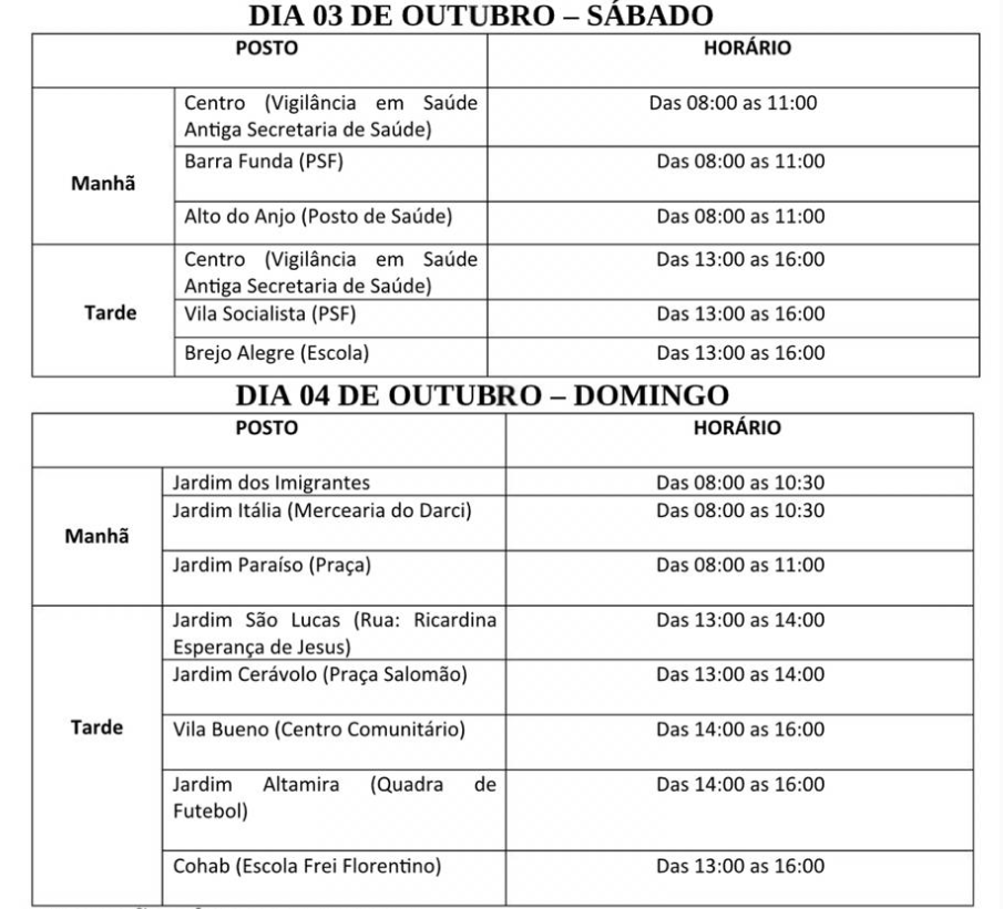 A Vacinação acontecerá na área urbana em diferentes locais nos dias 03 e 04 de Outubro (Sábado e Domingo).