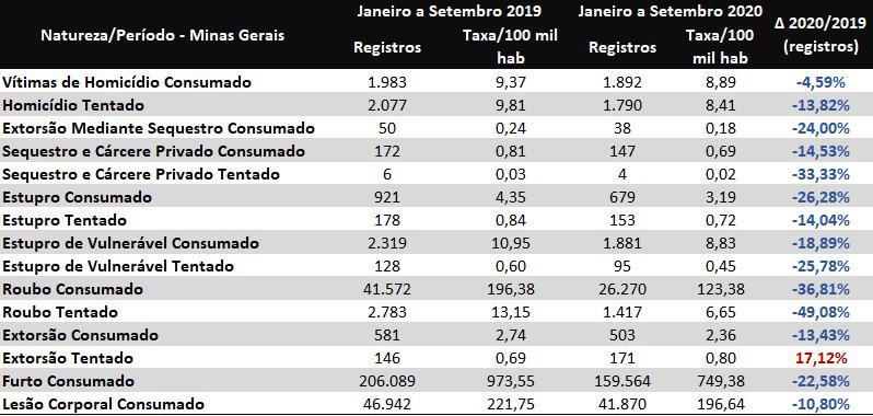 Outros indicadores de destaque são os dados de roubo e furto consumados, que permanecem em queda em Minas, tendo registrado redução de 36,8% e 22,6%, respectivamente. O índice de estupros consumados também caiu significativamente, com diminuição de 26,3% nas ocorrências em 2020.