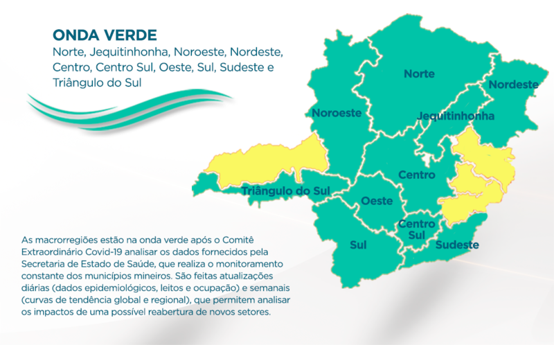 Dez das 14 macrorregiões de Saúde mineiras estão na onda verde do Minas Consciente, plano elaborado pelo Governo de Minas para garantir a retomada segura e gradual da economia nos municípios.