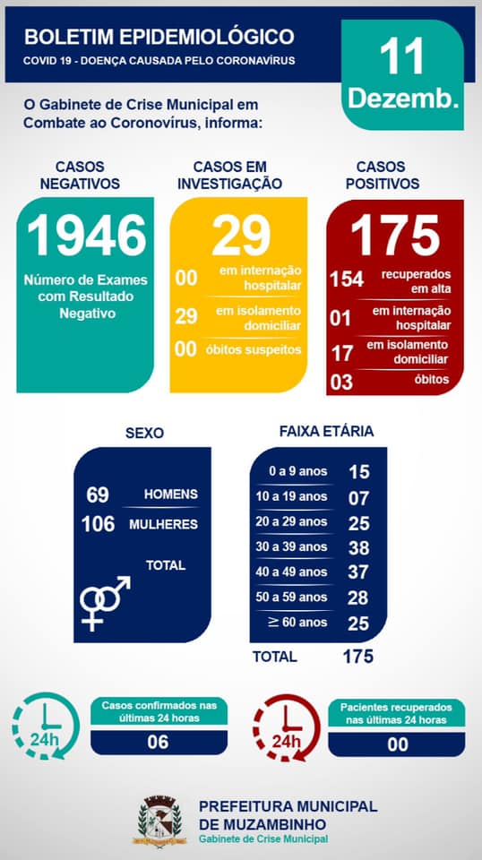 Muzambinho/MG, 175 Casos Positivos de COVID, sendo: 154 recuperados em alta, 01 internado, 17 em Isolamento domiciliar e 03 óbitos, 69 Homens e 106 Mulheres.