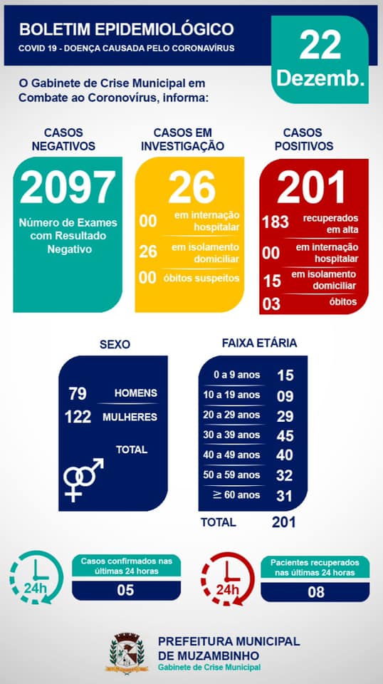 Muzambinho/MG, 201 Casos Positivos de COVID, sendo: 183 recuperados em alta, 00 internado, 15 em Isolamento domiciliar e 03 óbitos, 79 Homens e 122 Mulheres.