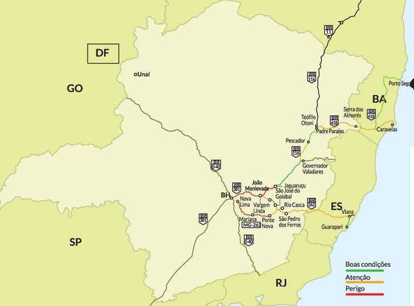 A reportagem do Estado de Minas levantou no Dnit e em órgãos estaduais mineiros, capixabas e baianos as condições de três itinerários de Belo Horizonte para Guarapari (ES) e Porto Seguro (BA), que estão entre os destinos mais procurados pelos mineiros. Apesar da grande procura, as estradas de acesso a esses locais – de pistas simples – não estão entre as mais seguras para os motoristas, diferentemente de outras rodovias que cortam o estado, como a BR-040, para o Rio de Janeiro, BR-262, para o Triângulo, BR-040, para Brasília, e a BR-381 (Fernão Dias), rumo a São Paulo. Ao todo, foram pesquisados 1.347,3 quilômetros, dos quais 790,9 (58,7%) se encontram sem condições ideais de tráfego, enquanto 556,4 quilômetros são considerados bons.
