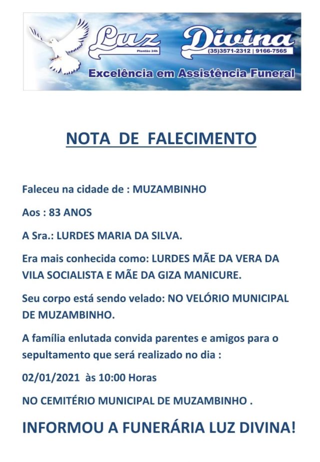 Mais Artigos DestaqueEventos e FestasNossa Cidade Artesãos de Muzambinho serão homenageados em sarau especial na Casa da Cultura DestaqueNossa CidadeReligião Igreja Presbiteriana Independente de Muzambinho celebra 103 anos com culto especial DestaqueNossa CidadePrevisão do Tempo Semana começa com sol e termina com pancadas de chuva em MuzambinhoDestaqueObituárioFaleceu aos 83 anos a Sra. Lurdes Maria da Silva. Redação2 de janeiro de 20211min0Informou a Funerária Luz DivinaA família enlutada, nossos sinceros sentimentos de pesares, que Deus os abençoe e conforte. Post Views: 668EnterroFuneráriaLuz DivinamorteobituárioSepultamentoVelório