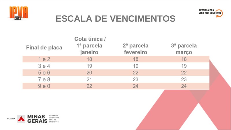 Para os demais proprietários de veículos de Minas Gerais, a escala de vencimentos do IPVA 2021 começa no dia 18 de janeiro e termina em 24 de março.
