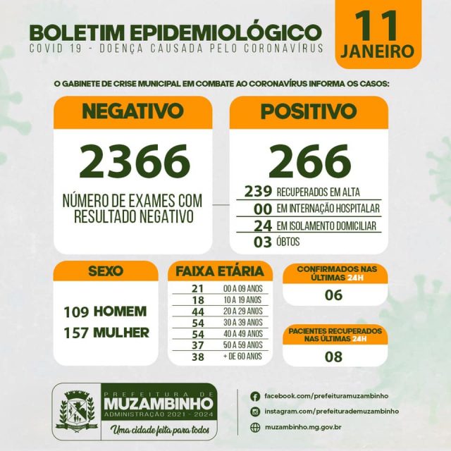 Muzambinho/MG, 266 Casos Positivos de COVID, sendo: 239 pacientes recuperados em alta, 00 internados, 24 em Isolamento domiciliar e 03 óbitos, 106 Homens e 154 Mulheres.