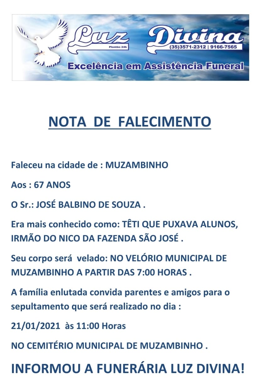 Mais Artigos DestaqueDiversos 3 hábitos comuns nas rodovias que podem colocar sua CNH em risco Cozinha e CulináriaDestaqueNossa CidadeParceiros Domingo combina com pizza! Hoje é dia de aproveitar! Cozinha e CulináriaDestaqueEventos e FestasNossa CidadeParceiros Neste Sábado a Tardezinha é na Gastronomia Sagrada FamíliaDestaqueObituárioFaleceu aos 67 anos o Sr. José Balbino de Souza. Redação21 de janeiro de 20211min0Informou a Funerária Luz DivinaA família enlutada, nossos sinceros sentimentos de pesares, que Deus os abençoe e conforte. Post Views: 714EnterroFuneráriaLuz DivinamorteobituárioSepultamentoVelório