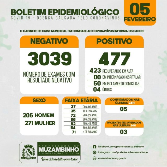 Boletim COVID-19 – Boletim do dia 05/02/21 – Muzambinho/MG