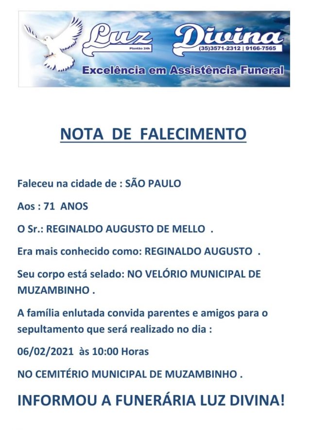 Mais Artigos DestaqueEconomia 13º salário dos aposentados: veja calendário e como consultar valor do benefício DestaqueLazerParceiros Cine14Bis: Confira a Programação Semanal DestaqueDiversosNossa Cidade APAE de Muzambinho convoca associados para Assembleia Geral Ordinária em maioDestaqueObituárioFaleceu aos 71 anos o Sr. Reginaldo Augusto de Mello. Redação6 de fevereiro de 20211min0Informou a Funerária Luz DivinaA família enlutada, nossos sinceros sentimentos de pesares, que Deus os abençoe e conforte. Post Views: 621EnterroFuneráriaLuz DivinamorteobituárioSepultamentoVelório