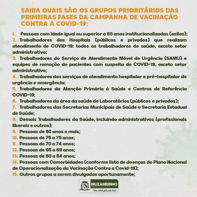 A Prefeitura de Muzambinho, através da Secretaria de Saúde, comunica a população que está finalizando a vacinação dos grupos de 1 a 7, e está aguardando o recebimento de novas remessas de vacinas para a vacinação gradual dos demais grupos prioritários, o início da vacinação desses grupos será divulgada.