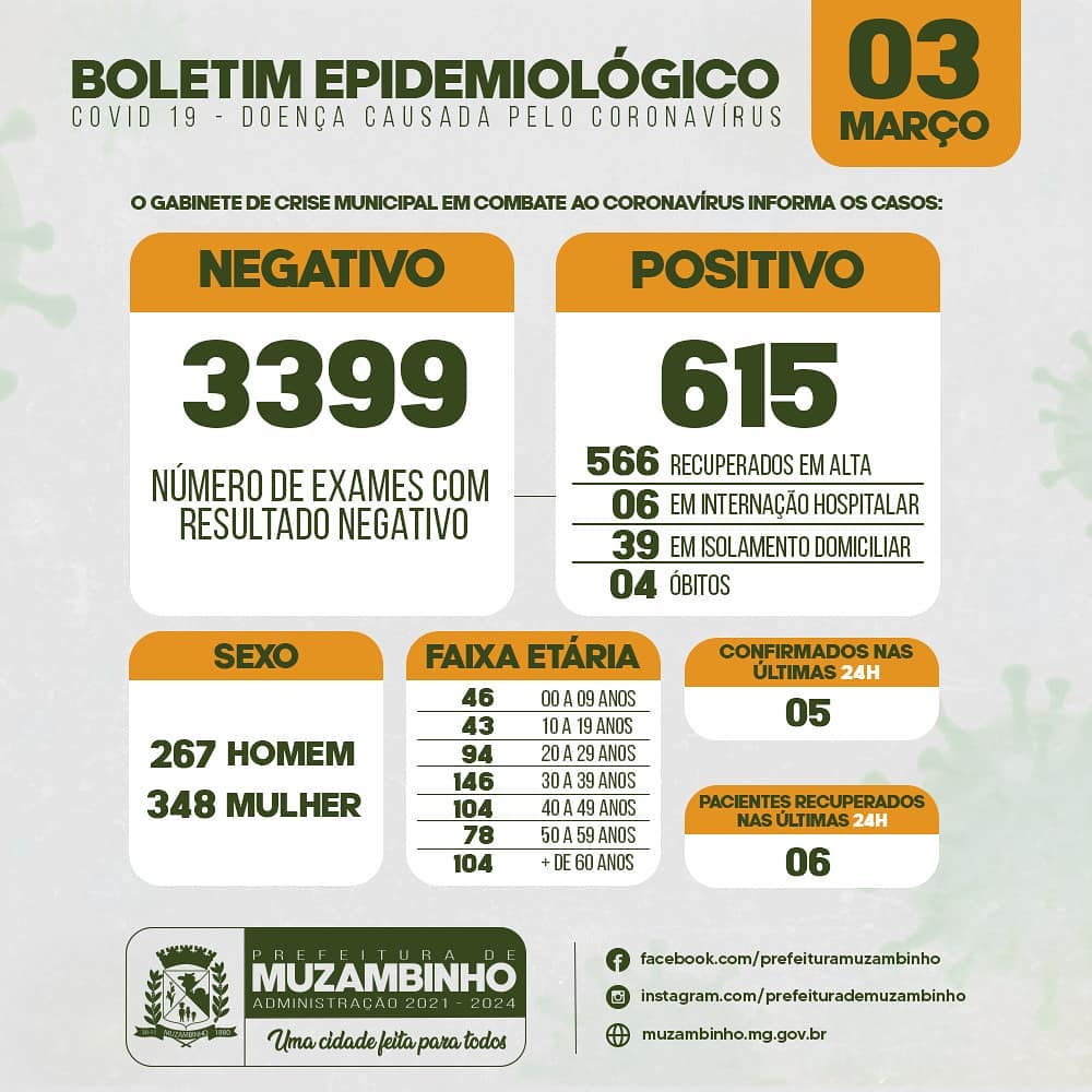 Subiu para 615 o total de CASOS POSITIVOS DE COVID-19 em Muzambinho. Foi confirmado o resultado POSITIVO para COVID-19 de mais 05 pacientes hoje (03/03), sendo dois pacientes do sexo masculino e três do sexo feminino.
