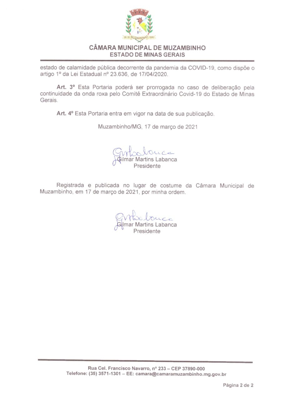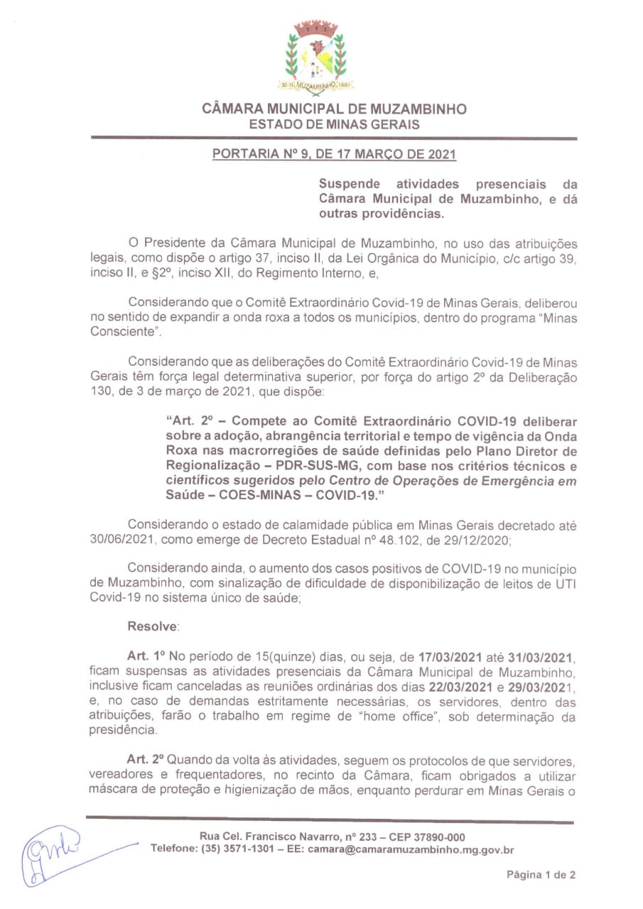 O Presidente da Câmara Municipal de Muzambinho, vereador Gilmar Labanca, informa aos muzambinhenses, a Portaria de Nº 9, de 17 de março de 2021, que suspende as atividades presenciais da Câmara. Considerando que o Comitê Extraordinário Covid 19 de Minas Gerais deliberou no sentindo de expandir a onda roxa em todos os municípios, dentro do programa Minas Consciente. Diante do atual momento, pedimos a colaboração de toda a população.