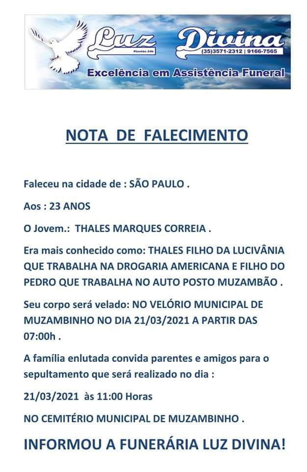 Mais Artigos DestaqueEventos e Festas Que dia começa o Carnaval neste ano? Confira as datas da folia DestaqueEducaçãoNossa Cidade Volta às aulas: escolas municipais de Muzambinho retomam atividades no dia 4 de fevereiro DestaqueDiversos Dois novos radares começam a funcionar no Sul de Minas a partir desta terça-feiraDestaqueObituárioFaleceu aos 22 anos Thales Marques Correia Redação20 de março de 20211min0Informou a Funerária Luz DivinaA família enlutada, nossos sinceros sentimentos de pesares, que Deus os abençoe e conforte. Post Views: 964EnterroFuneráriaLuz DivinamorteobituárioSepultamentoVelório