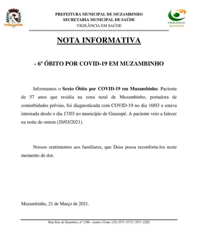 Também foi Registrado o 6º Óbito por COVID-19 de uma paciente de 57 anos que estava internada em leito de UTI no município de Guaxupé, conforme nota informativa abaixo.