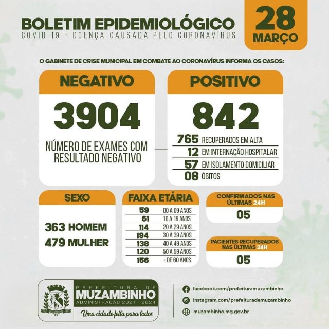 Sendo assim, Muzambinho totaliza 842 Casos Positivos de COVID-19: