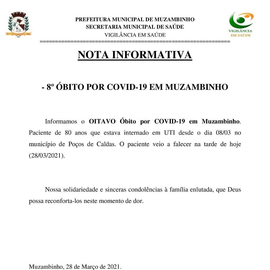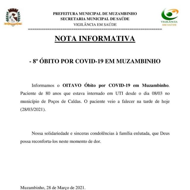 Registrou também o 8º Óbito por COVID-19 de um paciente de 80 anos que estava internado em leito de UTI no município de Poços de Caldas, conforme nota informativa em anexo.