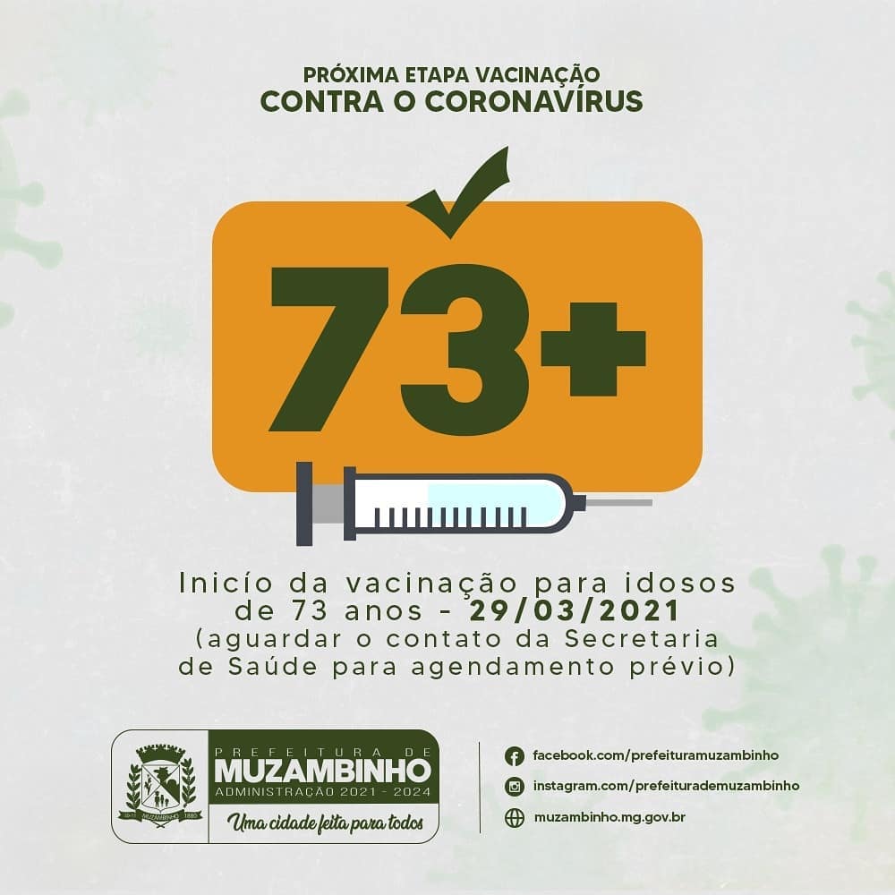 Mais Artigos DestaqueEsportesNossa Cidade Trilha do Abismo reúne motociclistas em evento de aventura neste domingo em Muzambinho Cozinha e CulináriaDestaqueEventos e FestasLazerNossa CidadeParceiros Sábado e Domingo no Pesqueiro Harmonia com muita diversão e sabor: Venha com os Amigos e Família DestaqueEmpreendedorismoNossa CidadeParceiros 5 Sinais de que sua Casa precisa de um Arquiteto DestaqueNossa CidadeSaúdeVacinação Covid em Muzambinho abre para idosos a partir de 73 anos. Redação29 de março de 20211min0Para estes idosos a vacinação teve início nesta segunda-feira, 29/03/21.O departamento responsável estará entrando em contato para agendar a vacinação. Post Views: 545 COVID-19Prefeitura de MuzambinhoVacina