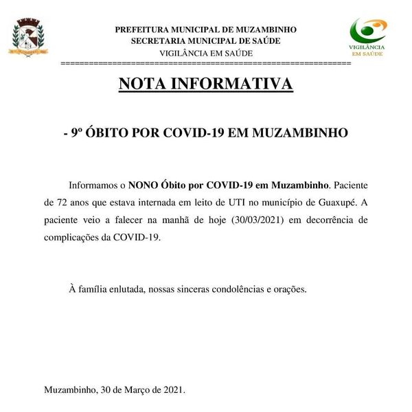 Foi registrado o 9º Óbito por COVID-19 de uma paciente de 72 anos que estava internada em leito de UTI no município de Guaxupé, conforme nota informativa em anexo.