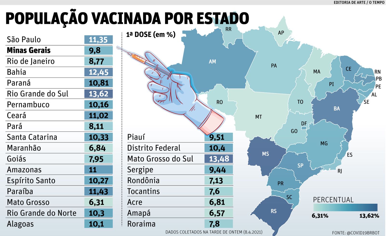 De acordo com dados do Vacinômetro do Ministério da Saúde dessa quinta-feira (8), Minas aplicou 51,6% das doses recebidas pelo Ministério da Saúde. Apenas quatro unidades da Federação têm percentual pior – Rio de Janeiro, Paraná, Distrito Federal e Amazonas.