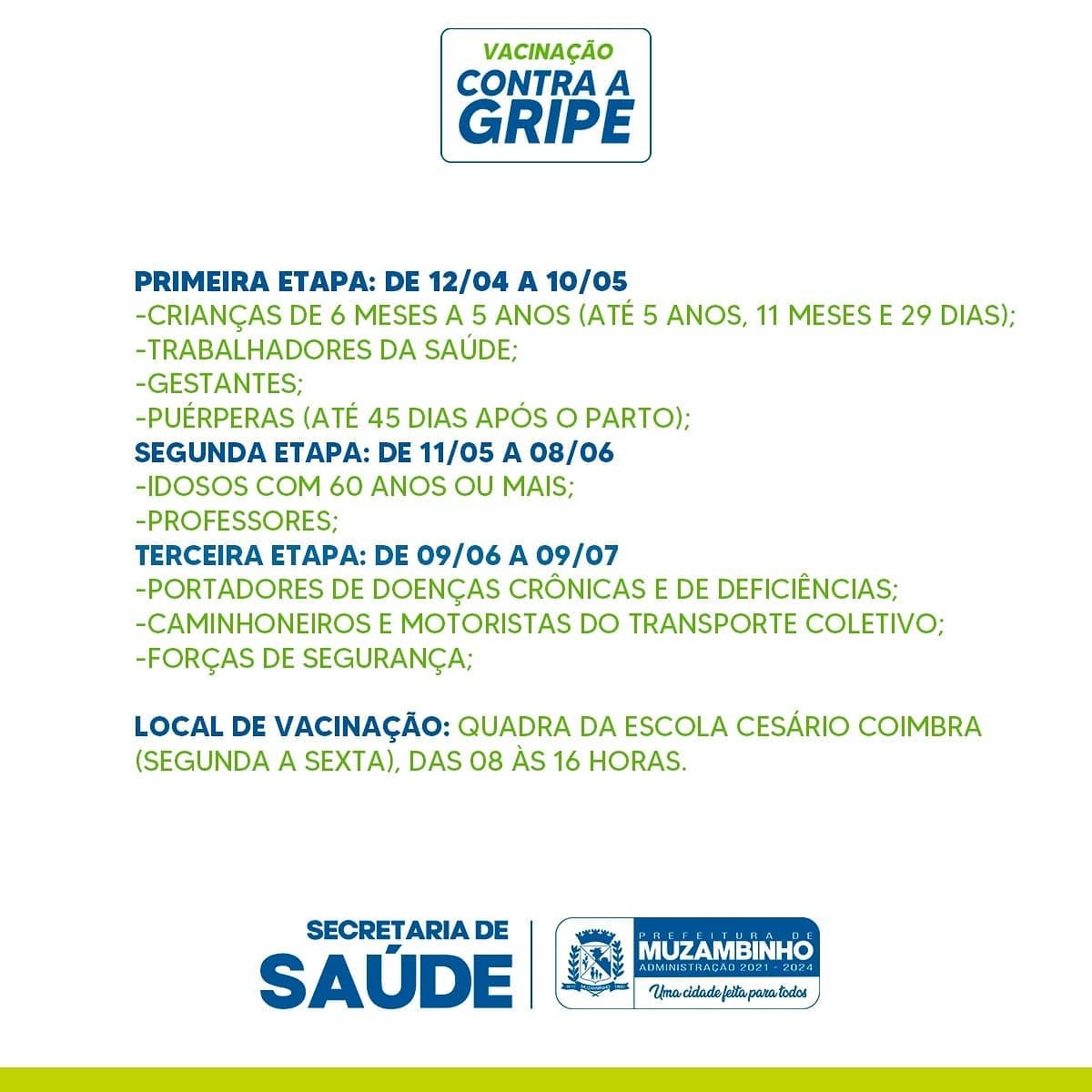 Segundo o Prefeito Paulinho Magalhaes, a quadra da Escola Estadual Cesário Coimbra foi escolhida como local para a realização da Campanha de Vacinação Contra a Gripe por ser de localização central, possuir amplo espaço físico e ótima ventilação, de forma que as pessoas possam receber a vacina de maneira segura e sem aglomerações, portanto, diferentemente da vacina contra a COVID-19, a vacinação contra a gripe não será com horário agendado, porém, os grupos serão vacinados conforme as etapas citadas acima.