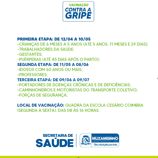 A prefeitura de Muzambinho, começou a vacinação contra gripe (influenza). De acordo com o calendário deste ano vão ser imunizados primeiro crianças de até 6 anos, trabalhadores da saúde, gestantes e puérperas.
