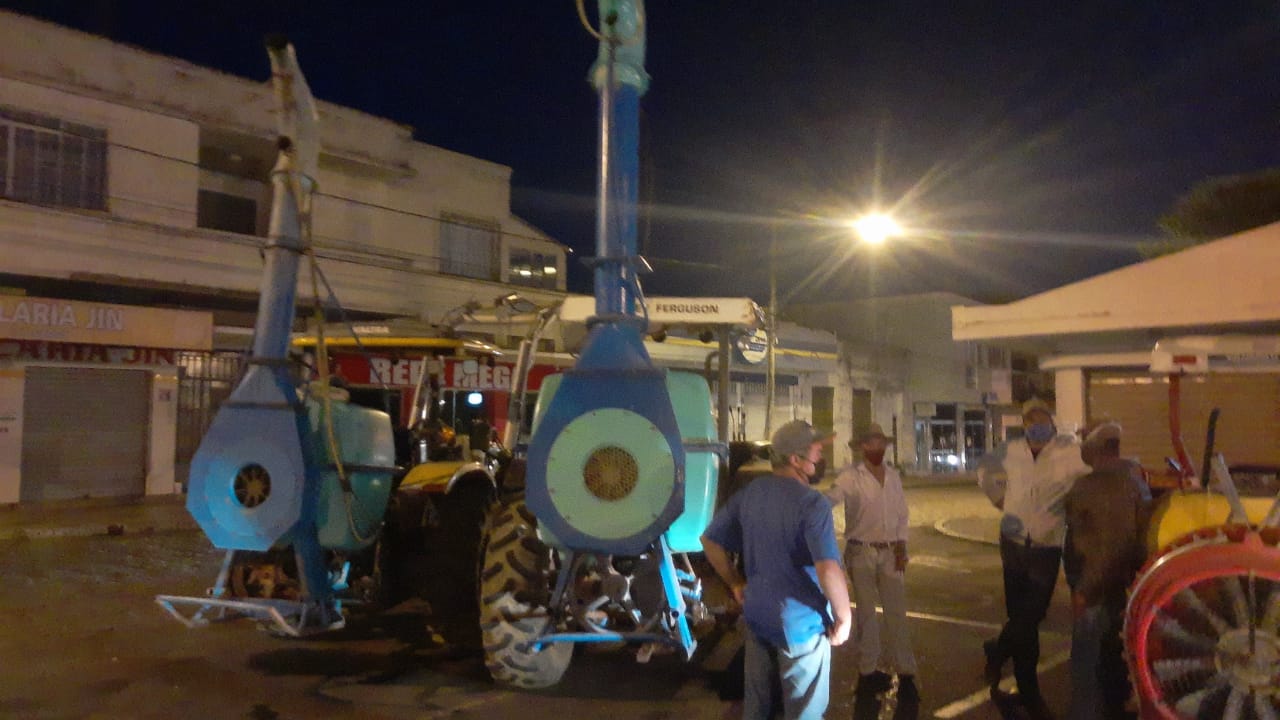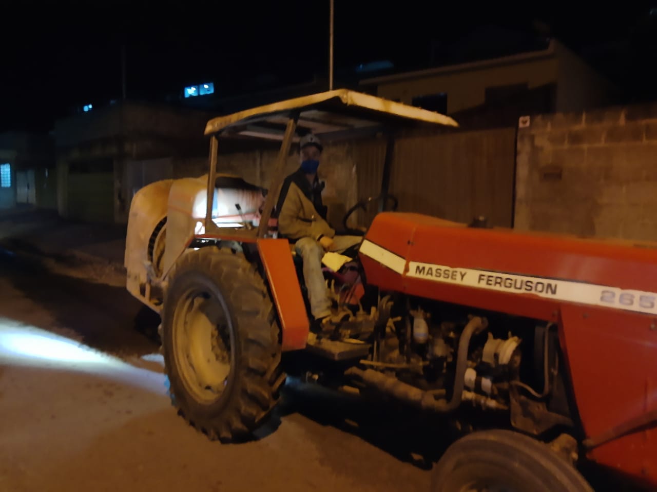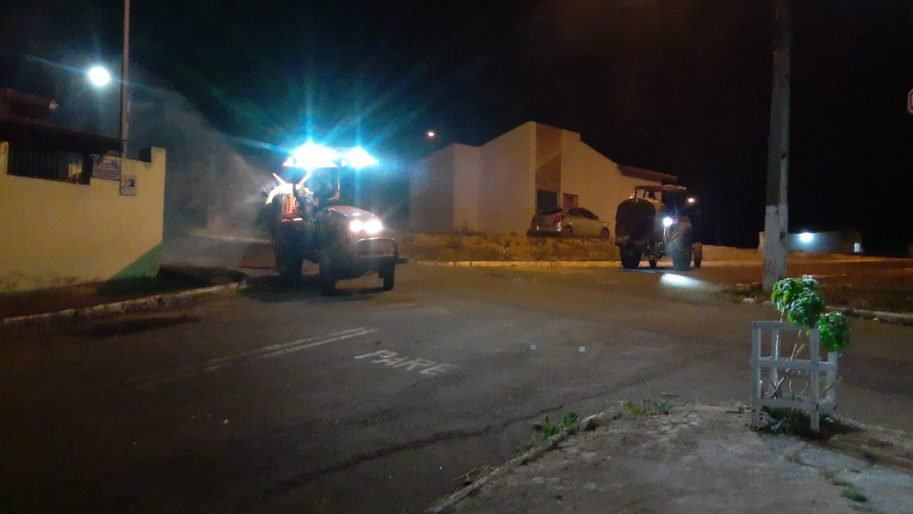 Terceira desinfecção das ruas realizada em parceria com os produtores rurais. O produto quaternário de amônia de 5ª geraçã, usado nos tanque dos tratores age como uma película que mata os micro-organismos que estão no local (vírus, bactérias, fungos e ácaros) e forma uma camada protetora que mantém o local desinfetado, explica o secretário de administração Heto Paixão.