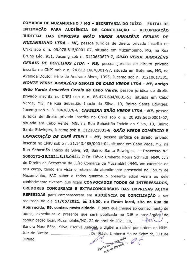 Processo de Recuperação Judicial da Empresa GRÃO VERDE ARMAZÉNS GERAIS, DESIGNADA PARA O DIA 11.05.2021, ÀS 14:00.