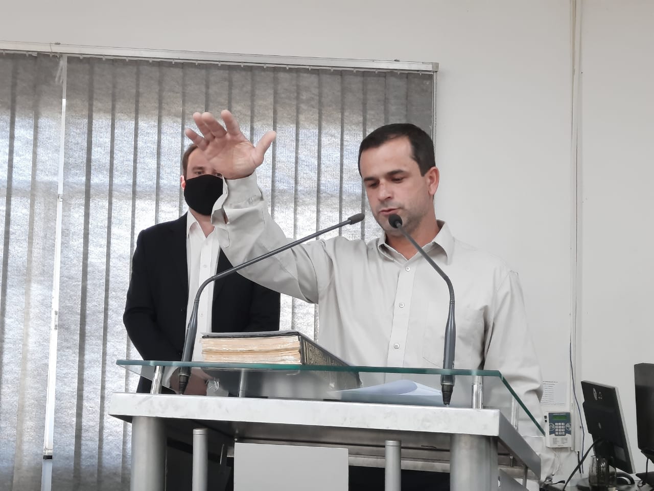 O novo prefeito de Juruaia Celso Marques Júnior, o Celsinho, foi empossado do cargo na tarde desta segunda-feira (03). Celsinho estava como prefeito em exercício de Juruaia desde a manhã de sexta-feira (30) por causa da morte do prefeito Alvinho. A cerimônia de posse foi comandada pelo presidente da Câmara de Juruaia, Toniel Alves de Trindade, e contou com a presença dos vereadores de Juruaia, secretários de governo, diretores e a família de Celsinho.