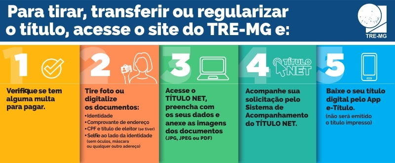O atendimento presencial continua suspenso em todas as unidades da Justiça Eleitoral em Minas Gerais, devido à pandemia de covid-19. Para solicitar a emissão da primeira via do título, transferência ou revisão (que inclui a atualização de dados e regularização da inscrição), o eleitor deve usar o sistema Título Net, no site do TRE.