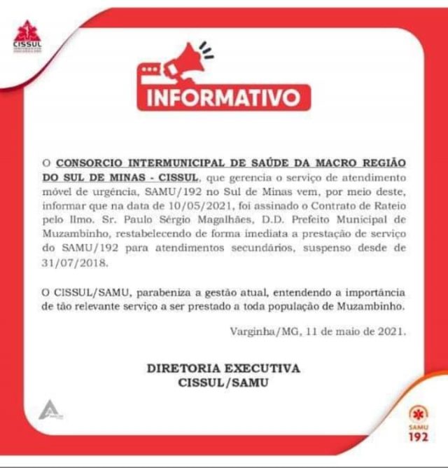 Mais Artigos DestaqueObituário Faleceu aos 65 anos o Sr. Pedro Silva Rita Magalhães AgronegócioDestaque Café em Foco, 17/03/26, Cotações e Informações da Cafeicultura AgronegócioDestaqueEventos e Festas Femagri 2026 começa amanhã no Sul de Minas e reúne cafeicultores para investimentos nas lavourasDestaqueNossa CidadePolíticaSaúdePrefeito Paulinho assinou Contrato com a Cissul/Samu Redação11 de maio de 20211min0Com esta assinatura, Muzambinho restabelece o Atendimento do SAMU. Post Views: 874CissulPrefeitura de Muzambinhosamu