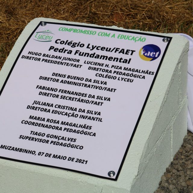 Em Cerimônia reservada devido as circunstâncias que atravessamos, o momento foi acompanhado por representantes do Lyceu, da Faet, do IF Campus Muzambinho, do executivo, através da Secretária de Educação, além do ex-vereador Marinho Menezes que foi o responsável por esta doação por parte do Município. O Lançamento da Pedra Fundamental é uma Cerimônia que marca o início de uma construção/obra.