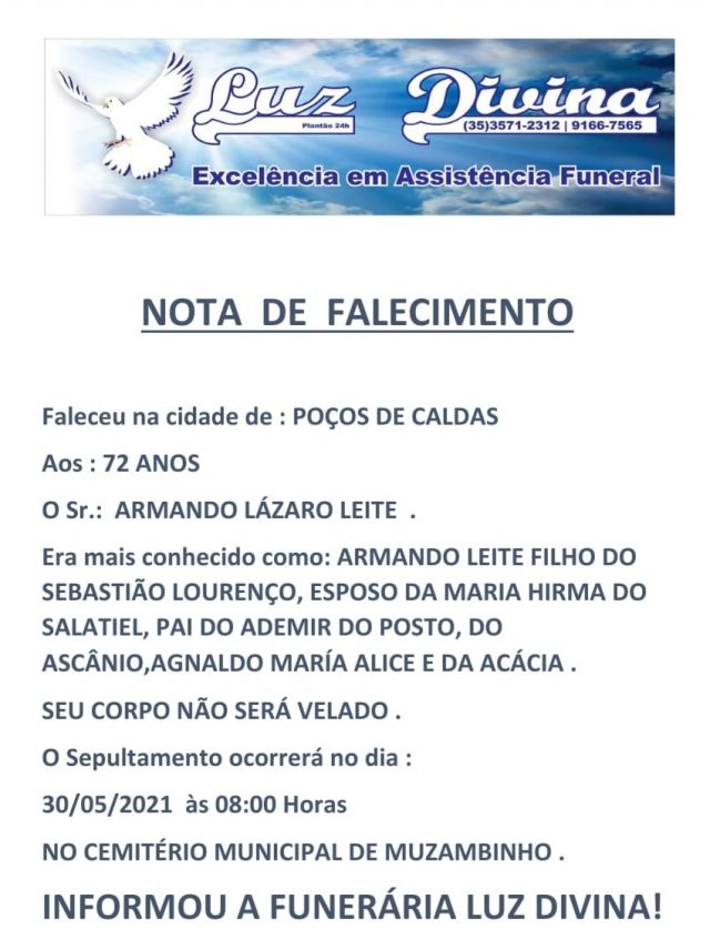 Mais Artigos AgronegócioDestaqueEducaçãoNossa CidadeParceiros Agricultura Familiar: Encontro em Muzambinho articula venda de produtos locais para merenda escolar CulturaDestaqueNossa CidadeParceiros Motriz apresenta nova diretoria e reforça compromisso com a cultura e inclusão em Muzambinho AniversáriosDestaque Quatro décadas de história: Fabrício Santos Ritá celebra 40 anos entre amigosDestaqueObituárioFaleceu aos 72 anos o Sr. Armando Lázaro Leite Redação30 de maio de 20211min0Informou a Funerária Luz DivinaA família enlutada, nossos sinceros sentimentos de pesares, que Deus os abençoe e conforte. Post Views: 770EnterroFuneráriaLuz DivinamorteobituárioSepultamentoVelório