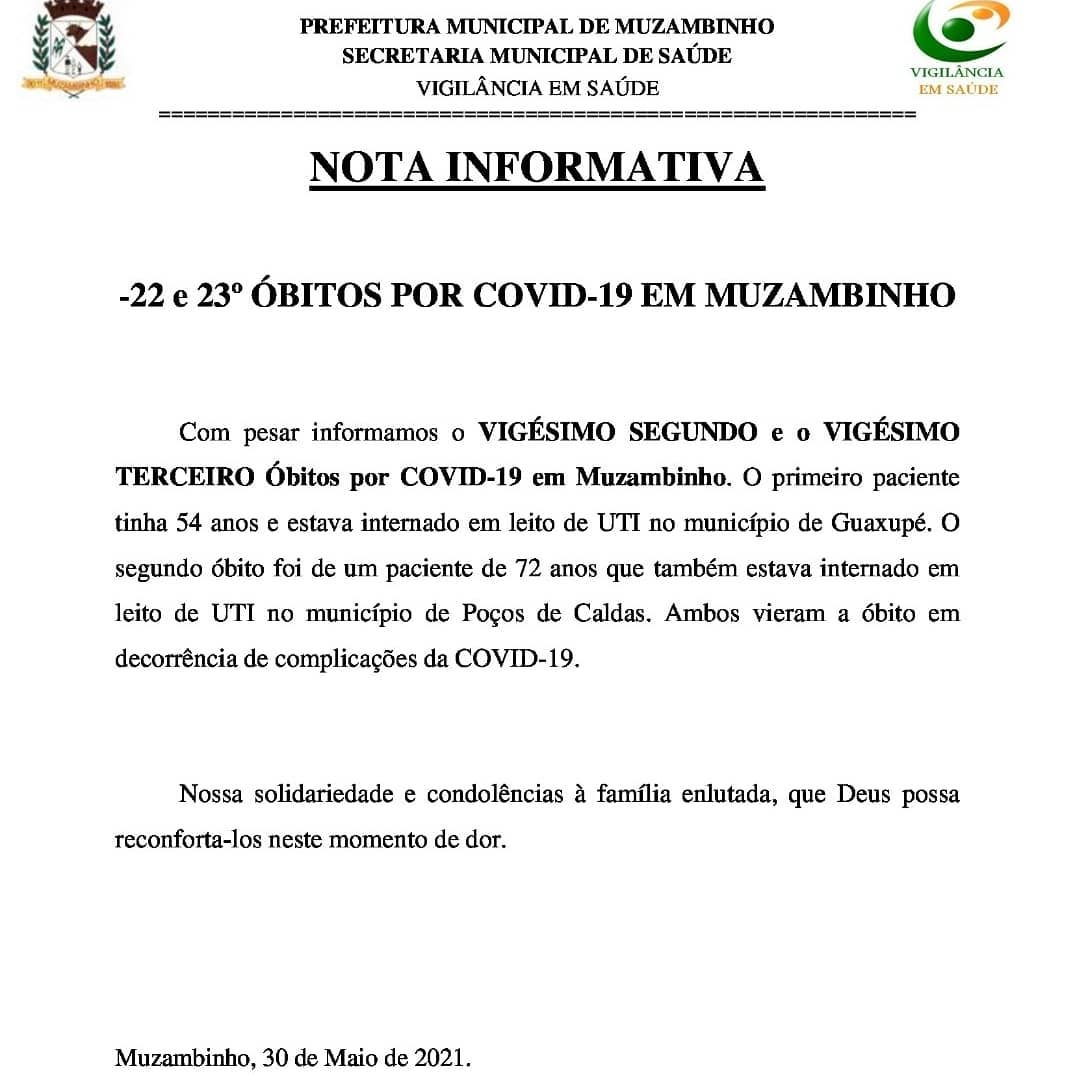 Informamos também o 22º e o 23º óbitos por Covid-19. Pacientes de 54 e 72 anos de idade que estavam internados em leito de UTI, conforme nota informativa em anexo.