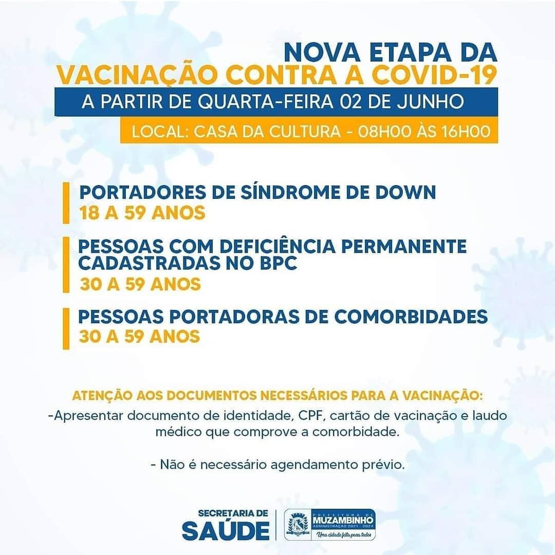 O Centro de Vacinação contra o Coronavírus, está funcionando na Casa Da Cultura de Muzambinho e está funcionou normalmente neste feriado, 03/06, e nesta sexta-feira, 04/06 continua atendendo.