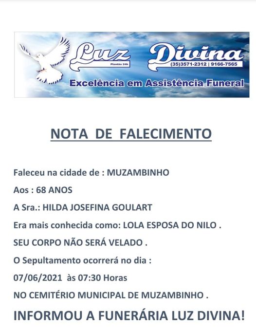 Mais Artigos DestaqueNosso EstadoPrevisão do Tempo Mais de 500 cidades mineiras estão em alerta para tempestade com ventania e granizo DestaqueExecutivoNossa Cidade Atenção moradores: coleta de lixo muda no feriado de Ano Novo em Muzambinho DestaqueDiversos Governo federal divulga calendário de feriados e pontos facultativos de 2026DestaqueObituárioFaleceu aos 68 anos a Sra. Hilda Josefina Goulart Redação7 de junho de 20211min0Informou a Funerária Luz DivinaA família enlutada, nossos sinceros sentimentos de pesares, que Deus os abençoe e conforte. Post Views: 923EnterroFuneráriaLuz DivinamorteobituárioSepultamentoVelório
