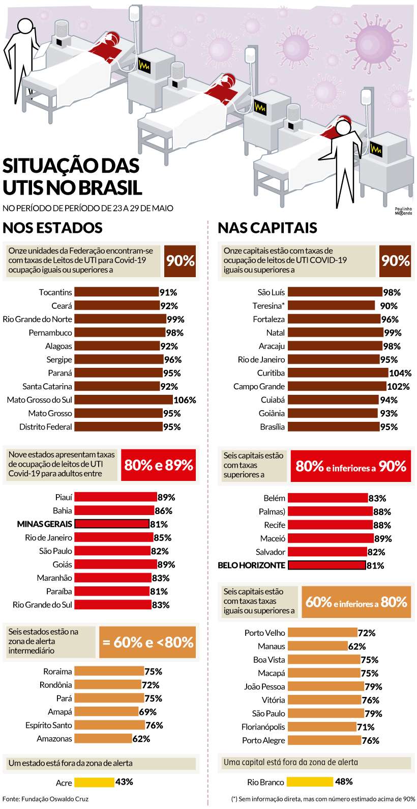 Dados publicados pelo Observatório da Fundação Oswaldo Cruz na sexta-feira (4/6) mostram que as taxas de ocupação de leitos de UTI do SUS para COVID-19 é superior a 80% em 20 estados brasileiros. Em outros seis, a situação é pré-crítica, ou seja, mais de 70% das vagas disponíveis estão em uso. Treze unidades da federação já acumulam filas de espera por leitos, incluindo Minas Gerais.