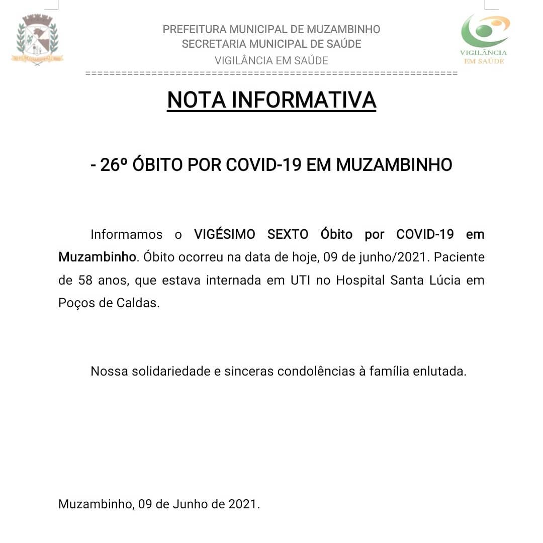 Foi registrado também o 26º óbito por Covid-19. Paciente de 58 anos de idade, que estava internada em Poços de Caldas, conforme nota informativa em anexo.