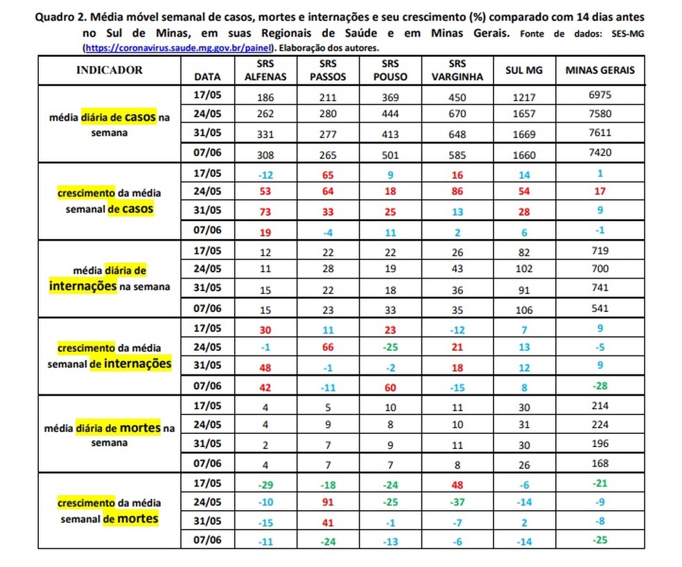 Dentre os municípios mais populosos, Varginha e São Sebastião do Paraíso foram as únicas cidades que apresentam crescimento na média semanal de casos. Foram 30% e 35%, respectivamente. Varginha registra tendência crescente do contágio há um mês.