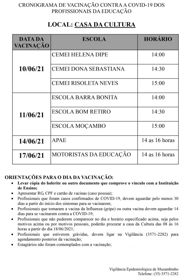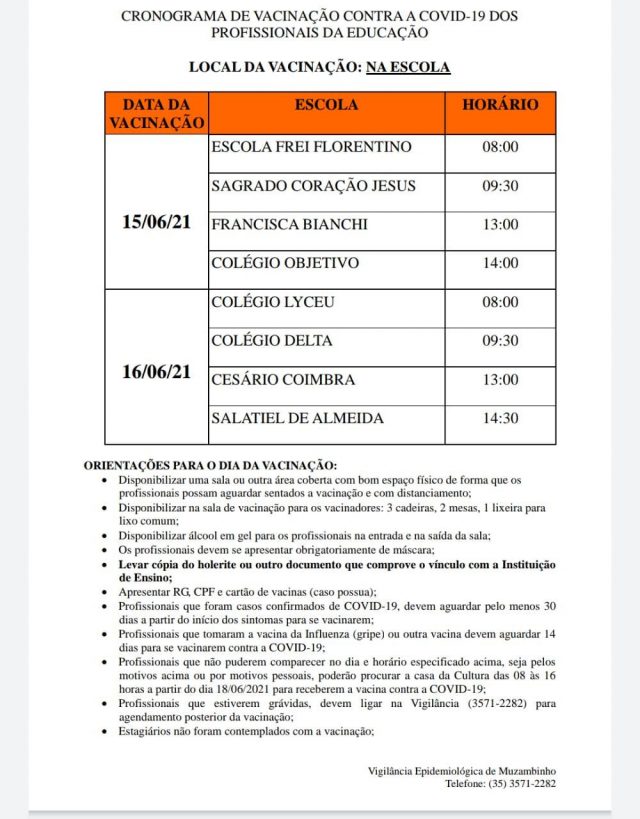 Mais Artigos DestaqueEsportesEventos e FestasNossa Cidade 1ª Corrida Amor Azul mobiliza comunidade em Muzambinho e reforça conscientização sobre o autismo AgronegócioDestaqueEducaçãoNossa Cidade ENCONTEC 2026 movimenta Muzambinho com inovação, tecnologia e integração entre comunidade e estudantes DestaqueObituário Faleceu aos 69 anos a Sra. Aparecida Alves Ribeiro LopesDestaqueNossa CidadeSaúdeMuzambinho está vacinando os Profissionais da Educação contra Covid-19. Redação11 de junho de 20211min0Acesse e Confira o Cronograma, locais e orientações gerais. Post Views: 803EducaçãoProfessoresVacina