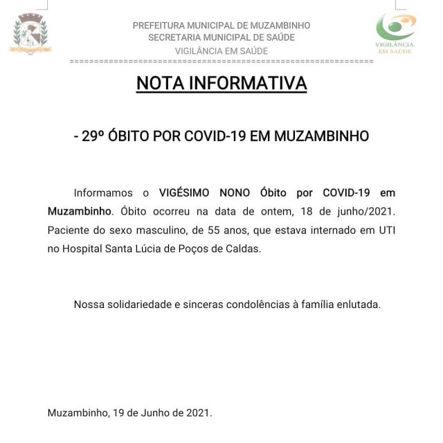 Comunicamos também o 29º óbito por COVID-19 do município de Muzambinho. Paciente do sexo masculino, de 55 anos de idade, conforme nota informativa em anexo.