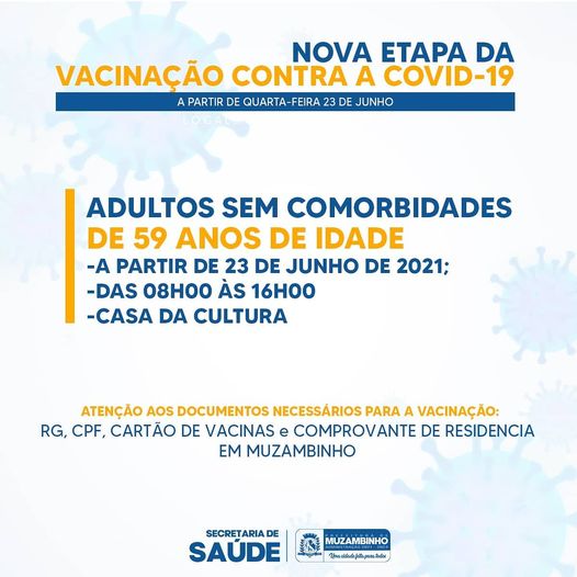 A partir do dia 23/06 será iniciada a vacinação contra a COVID-19 dos ADULTOS DE 59 ANOS DE IDADE sem comorbidades. Para receber a dose do imunizante o paciente precisa comprovar residência em Muzambinho a apresentar o CPF e documento de Identidade.