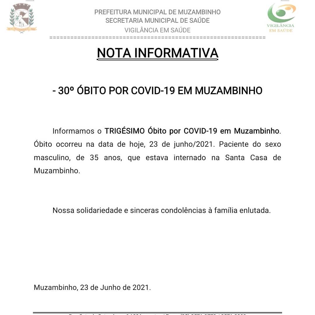 Comunicamos também o 30º óbito por Covid-19. Paciente do sexo masculino, de 35 anos de idade, conforme nota informativa.